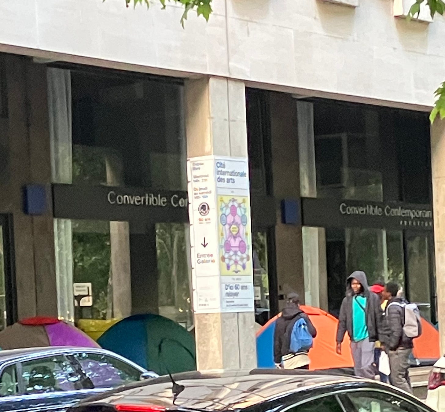 First, the tents. They are small but neat. And everywhere, because in France, too, homelessness is a big, gnarly problem. The tents are not bulldozed away, but allowed to pitch on public and private property, even in ‘tourist zones.’ This row stands in front of an upscale furniture showroom. Imagine. First things first, including dignity and respect for other human beings.