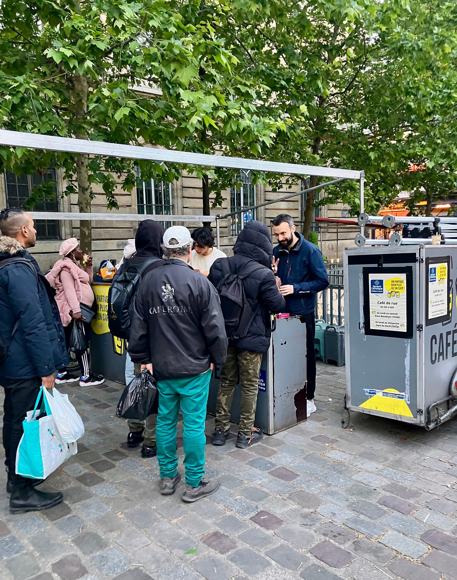 Next , the sharing of ‘un p’tit café.’ What, not a full meal? Well, there are many places where meals are served, no questions asked, but it’s the little cup of strong coffee that holds the Gallic culture together, and creates one-on-one relationships, however fleeting. (Respect, again. A major component of both empathy and fraternité, I’m noting on my walks.) And so, these volunteer-organized, outdoor coffee stands have sprung up around town. Judging by the lines, they are appreciated. The ‘ptit’ must be brewed to perfection!